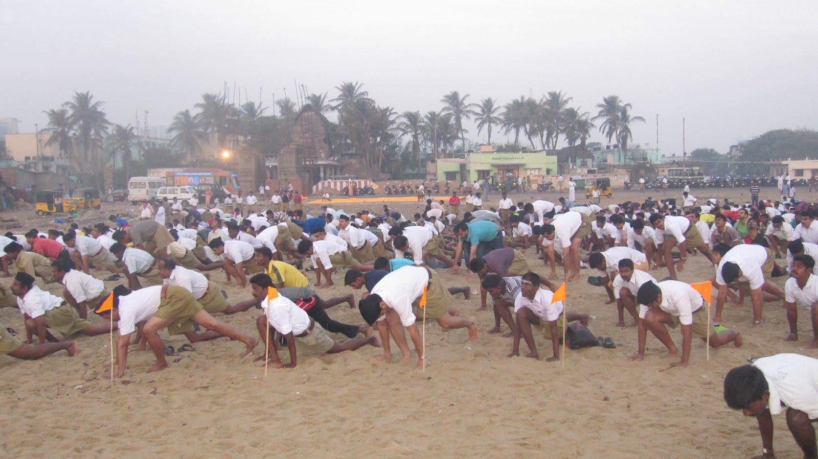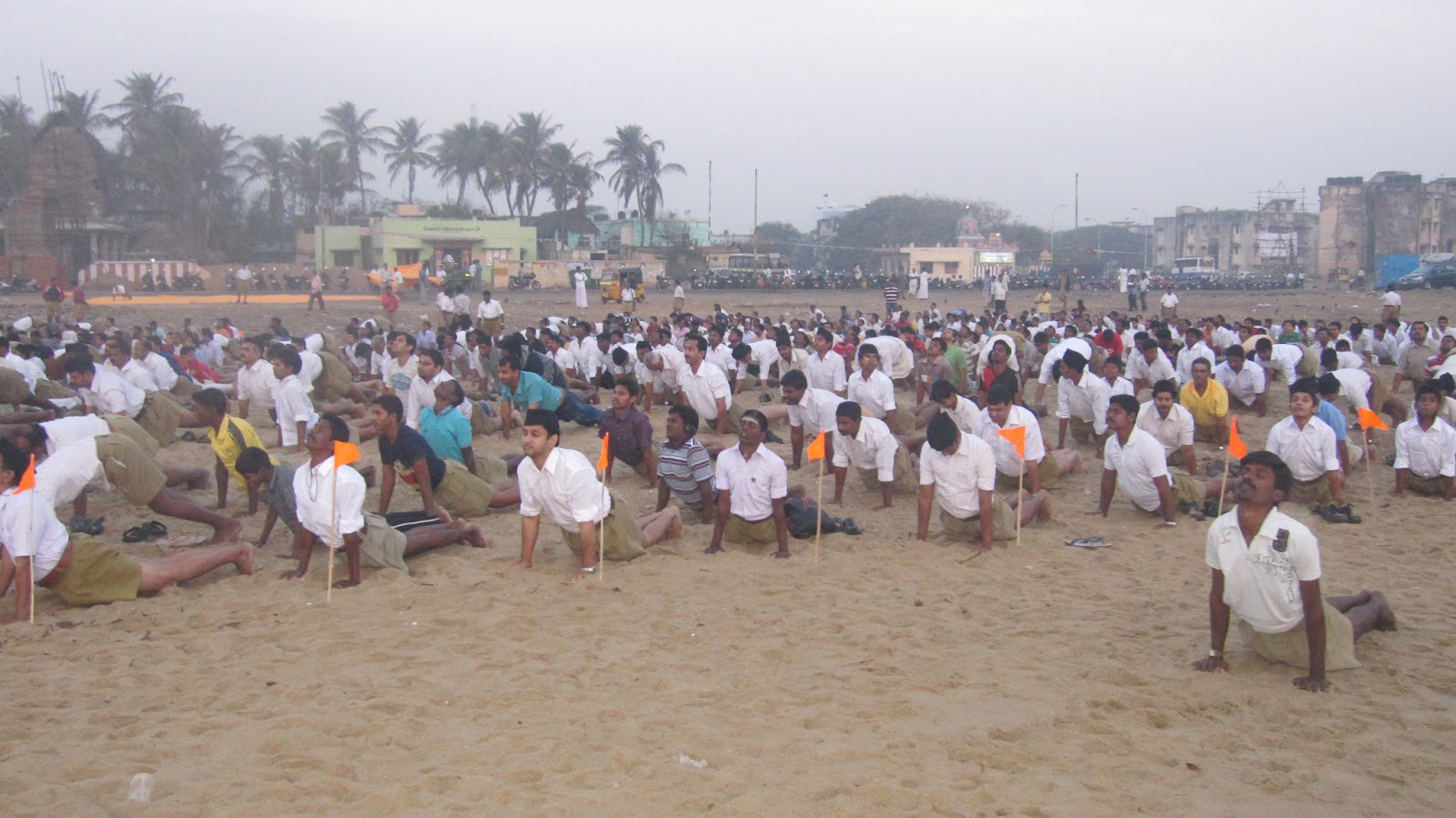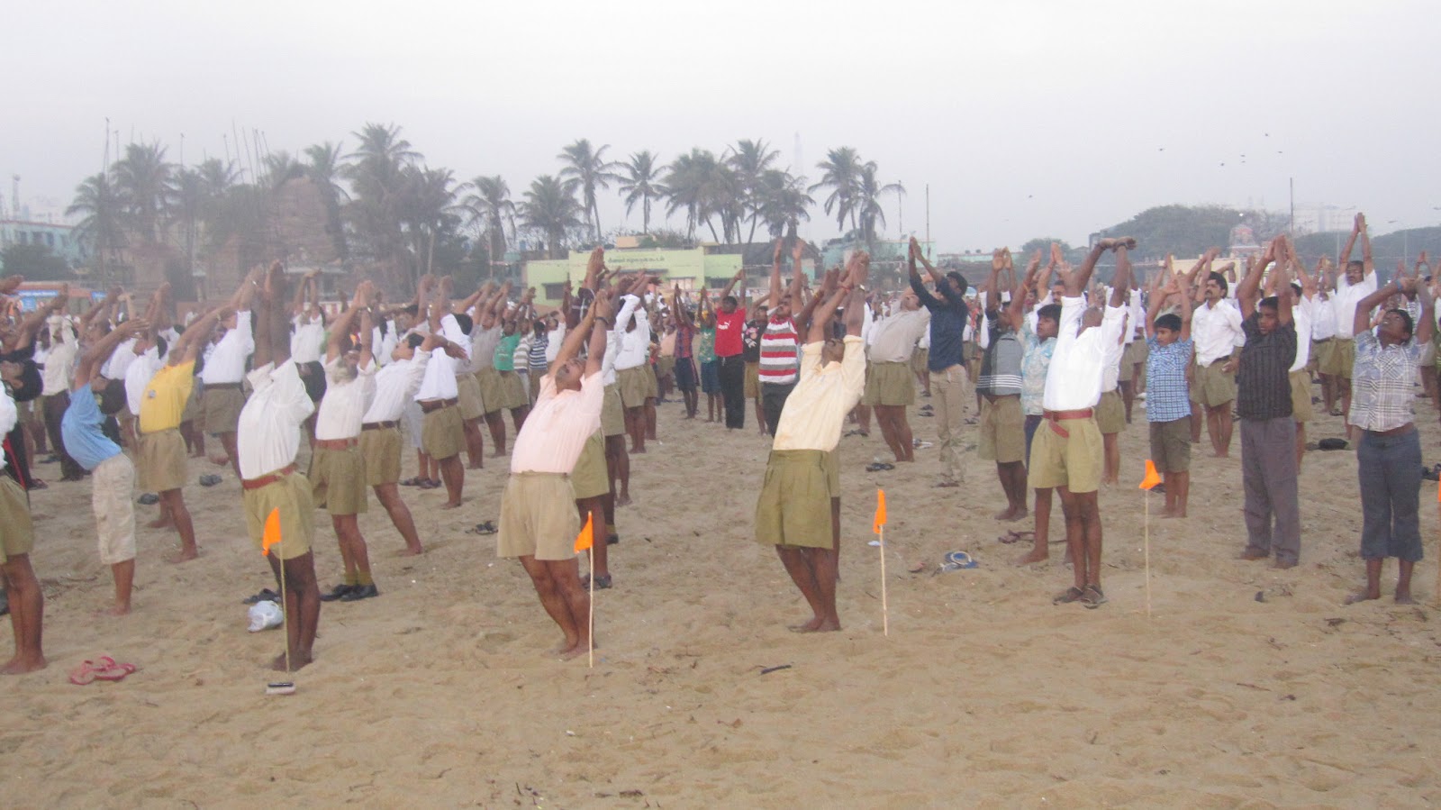RSS Chennai has built a tradition, which is more than 5 decades, of celebrating Sankranti function on the shores of Chennai beach precisely at the time of sun rise. The Swayamsevaks exactly at the stroke of 6.39 a.m., the time of sunrise, performed 13 suryanamaskars with mantra.