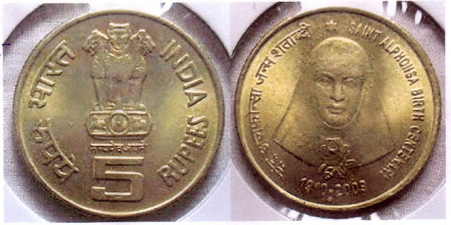 The here surreptitiously, there openly, the now contemptuously, defiantly, blatantly, sometimes clandestinely and ever consistently Evangelical anti-Hindu Sonia Congress UPA II Government has given a death blow to the doctrine of SECULARISM enshrined in the Indian Constitution by issuing a 5 Re Coin carrying the image of Saint Alphonsa Muttathupadathu (1910-1946). This has been done with focus on the ensuing elections to the Kerala Legislative Assembly. Please see this Sonia Christian 5 Re coin below. (Please see the image of Saint Alphonsa on the coin on the right below)