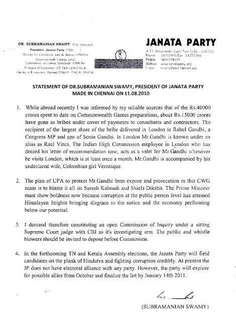 Dr.Subramanian Swamy, President of the Janata Party and former Union Minister for Law and Commerce—the heroic Vir Hanuman who taught a salutary lesson to the despicable and corrupt dictator Indira Gandhi in the dark days of her draconian Emergency from 1975 to 1977—issued the following Press Statement at Chennai on 11-8-2010 on the HIMALAYAN CORRUPTION of Rahul Gandhi.